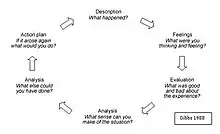 Gibbs' suggestions are often cited as "Gibbs' reflective cycle" or "Gibbs' model of reflection", and simplified into the following six distinct stages to assist in structuring reflection on learning experiences:[25]