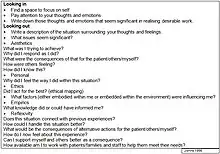 Johns highlights the importance of experienced knowledge and the ability of a practitioner to access, understand and put into practice information that has been acquired through empirical means. Reflection occurs through "looking in" on one's thoughts and emotions and "looking out" at the situation experienced. Johns draws on the work of Barbara Carper to expand on the notion of "looking out" at a situation.[28] Five patterns of knowing are incorporated into the guided reflection: the aesthetic, personal, ethical, empirical and reflexive aspects of the situation. Johns' model is comprehensive and allows for reflection that touches on many important elements.[29]