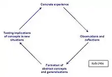 Learning theorist David A. Kolb was highly influenced by the earlier research conducted by John Dewey and Jean Piaget. Kolb's reflective model, which also draws from the works of Kurt Lewin,[17] highlights the concept of experiential learning and is centered on the transformation of information into knowledge.[18] This takes place after a situation has occurred, and entails a practitioner reflecting on the experience, gaining a general understanding of the concepts encountered during the experience, and then testing these general understandings in a new situation.[17] In this way, the knowledge that is formed from a situation is continuously applied and reapplied, building on a practitioner's prior experiences and knowledge.[19]