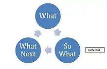 Terry Borton's 1970 book Reach, Touch, and Teach popularized a simple learning cycle inspired by Gestalt therapy composed of three questions which ask the practitioner: What, So what, and Now what?[15] Through this analysis, a description of a situation is given which then leads into the scrutiny of the situation and the construction of knowledge that has been learnt through the experience. Subsequently, practitioners reflect on ways in which they can personally improve and the consequences of their response to the experience. Borton's model was later adapted by practitioners outside the field of education, such as the field of nursing and the helping professions.[16]