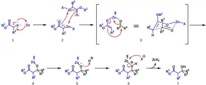 Zinc metal is inserted into the carbon-halogen bond of the α-haloester by oxidative addition 1. This compound dimerizes and rearranges to form two zinc enolates 2. The oxygen on an aldehyde or ketone coordinates to the zinc to form the six-member chair like transition state 3. A rearrangement occurs in which zinc switches to the aldehyde or ketone oxygen and a carbon-carbon bond is formed 4. Acid workup 5,6 removes zinc to yield zinc(II) salts and a β-hydroxy-ester 7.[5]