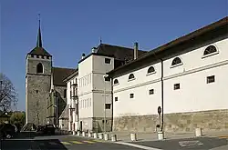 The church of Saint-Étienne was first mentioned in 1134–1143, even though it may have been built earlier. It was situated outside the Medieval village and was the counterpart of the Chapelle Notre-Dame located on the hill.[1] The church was nicknamed "the cathedral of Broye", a region around the Broye river, by the residents of Moudon. It was modelled after the Gothic style.[2] After a bell tower was added in 1420, the church was enlarged and renovated between 1495 and 1499, then again between 1499 and 1502. Paintings were added to the vaults between 1506 and 1511.[3]