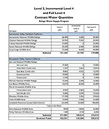 The amount of water identified as being required for the optimal management of a designated wetland is defined as that refuge's 'Full Level 4' quantity. The 555,515AF of water the RWSP is tasked with providing is the sum of all of the specified refuges' Full Level 4 quantities. Full Level 4 is a contractually obligated amount of water that consists of 2 blocks, Level 2 and Incremental Level 4. Each refuge has a 'Full Level 4' quantity which is the sum of its total Level 2, and total Incremental Level 4 quantity of water. These amounts are provided in the table "RWSP Contract Water Quantities".