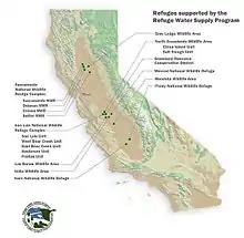 The Refuge Water Supply Program (RWSP) is administered by the United States Department of the Interior jointly by the Bureau of Reclamation and Fish and Wildlife Service and tasked with acquiring a portion and delivering a total of 555,515 acre feet (AF) of water annually to 19 specific protected wetland areas in the Central Valley of California as mandated with the passing of the Central Valley Project Improvement Act signed on October 30, 1992, by President George H. W. Bush. [1]