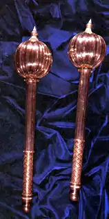 The Cogan Alam ("Sceptre of the Universe") is part of the Royal Regalia. This silver ceremonial mace symbolises power and is 162.66 cm long. It consists of an orb mounted on a long shaft. The orb is topped by a crescent and an eleven-pointed gold star. Around the equator of the orb, the crests of the eleven Peninsular Malaysian states are embossed in gold. The orb is supported by four tigers while the shaft itself is decorated with six padi stalks in gold.