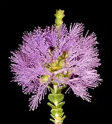 The flowers are mauve and arranged in dense heads 20–50 mm (0.8–2 in) across on the ends of branches which continue to grow after flowering. There are 5 sepals, 5 petals and 5 bundles of stamens. Flowering occurs over an extended period in spring and summer and is followed by fruit which are woody capsules in small, almost spherical clusters around the stem.[2][3][4]