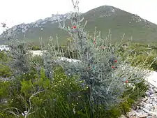 Regelia velutina is a large shrub, sometimes a small tree growing to a height of 6 m (20 ft), with long, straight stems. Its leaves, which are up to 13 mm (0.51 in) long are arranged in alternating pairs (decussate) so that they make four rows along the stems.[2][3]