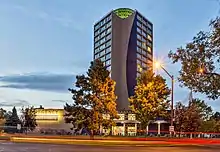 The Regency Hotel was built by real-estate developers Marvin and Victor Lederman, and designed by Richard DeGette, with construction starting in 1968.[2] It was designed to serve as a regional convention center, with banquet and meeting rooms, exhibit areas for car dealers, four restaurants, three bars, a disco, an indoor and an outdoor swimming pool, and tennis courts,[2] and was known for its large gold dome, the Piccadilly Rotunda.[3] The convention center had an authorized capacity of 4,350.[4] In the early and mid-1970s the hotel flourished; Elvis Presley stayed in the penthouse several times, and the hotel was said to keep a piano there for him.[5][6]