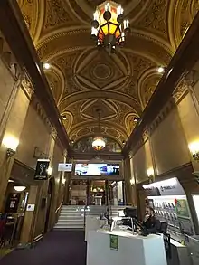 The grand foyer is an impressive single volume with richly ornamented walls and ceiling; predominantly Spanish Gothic with Baroque effects, such as the use of Rococo plasterwork and large mirrored surfaces. It is approximately 22 metres (72 ft) long, 12 metres (39 ft) wide and three-and-a-half storeys high. The doors leading from the entrance hall open into the western corner of the space. To the left stands a recent ticket and snacks counter which, along with various signage, is not considered to be of cultural heritage significance. Centrally placed along the south-eastern wall, and leading up to a mezzanine level, is the grand marble staircase. On either side of it, at ground level, are double doors that lead into spaces outside of the heritage boundary.[1]
