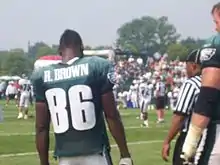 On December 16, 2007, during a game in Dallas against the rival Cowboys, Brown, after running to catch an overthrown pass, ran out of bounds and jumped in the giant Salvation Army bucket in Texas Stadium, saying he couldn't slow down in time to stop before it. He caught the lone touchdown in the Eagles 10โ6 win that day.[3]