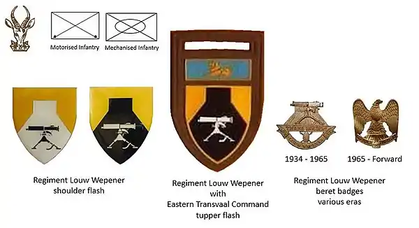 In 1960, it became Regiment Oos-Vrystaat (Regiment East Free State), but the original designation, Regiment Louw Wepener, was again re-adopted by 1966. The regiment at this stage had become motorised infantry. The regiment served under this name until well into the 1990s, when it was absorbed, together with Regiment Dan Pienaar, into Regiment Bloemspruit.[2]