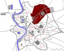 Regio VI was defined by its principal artery, the Alta Semita, which led from the Quirinal through the Porta Collina to the Porta Nomentana. The Aurelian Wall marked most of its eastern and northern edge along with the Via Salaria vetus, with the Argiletum and Vicus Patricius on the south and southeast.[1] The three principal gates that ran through the walls in this region were the Porta Nomentana, Porta Salaria and the Porta Pinciana. A measurement taken at the end of the 4th century recorded that the perimeter of the region was 15,700 Roman feet (approximately 4.64km).[2]