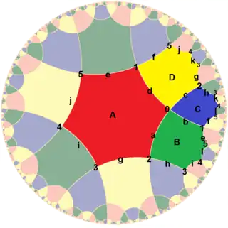 Five such regular abstract polyhedra, which can not be realised faithfully, were identified by H. S. M. Coxeter in his book Regular Polytopes (1977) and again by J. M. Wills in his paper "The combinatorially regular polyhedra of index 2" (1987). All five have C2×S5 symmetry but can only be realised with half the symmetry, that is C2×A5 or icosahedral symmetry.[9][10][11] They are all topologically equivalent to toroids. Their construction, by arranging n faces around each vertex, can be repeated indefinitely as tilings of the hyperbolic plane. In the diagrams below, the hyperbolic tiling images have colors corresponding to those of the polyhedra images.
