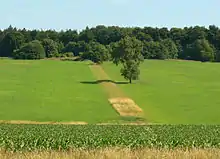 Bridges spanning the Weser river were constructed and used in mock battles with the participation of panzers and airplanes and a force of about 10,000 men, also featuring an attack on the Bückerdorf.[8] In 1935, the attendance of the peasants at the festival fell due to their dissatisfaction with the policies of the Nazi party and the enactment of the Entailed Farm Law.[10] The same year, a mock village was built on the hill. The village was the target of bombing by the air force and panzers and was eventually destroyed.[11] On 3 October 1937, Hitler during his address at the festival called on Britain to be "reasonable" and threatened to seek colonies.[12] In 1935, Göring, Goebbels and Rudolf Hess followed Hitler as he was greeting people while walking on the Führerweg.[11]