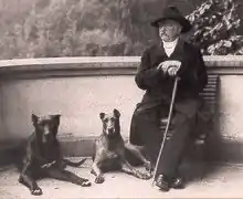 Keeping dogs in Germany became increasingly fashionable as the 19th century continued, and people in public life often did so as part of their image.[4] Bismarck reportedly took a blonde Great Dane called Ariel with him when he entered the University of Göttingen in 1832.[5] He continued to keep Great Danes throughout the rest of his life.[n 1] His favourite was Sultan (shortened to 'Sultl' to avoid diplomatic repercussions with Turkey[6]); on his deathbed he berated himself for not treating the dog better.[4] Sultan was a gift from the Bavarian Count Holnstein.[7][8] After Sultan's death on 26 October 1877, Bismarck could only be consoled by the gift of another Great Dane from Count Holnstein, Tyras.[9] Tyras died on 18 January 1889; Emperor Wilhelm II gave Bismarck Tyras II for his birthday the following April 1.[10] The dog died on 11 May 1896.[11]