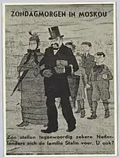Leading up to the German invasion, the National Socialist Movement spent much of the 1930s loudly denouncing the government's inability to protect the Dutch people from economic suffering, social chaos, and the expanding influence of Marxism-Bolshevism.[1] The group separated itself as an internal force, gaining a small degree of importance during that mid-1930s, and eventually contributing to the German efforts to nazify the occupied Netherlands.[3] The NSB began to admire the "achievements" of the German Reich by 1936 and broadcast their own warnings that "International Jewry" had taken a hold of the Netherlands and would conquer Europe.[4]
