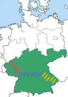 The Reihengräber culture, which developed within north-eastern Gaul under Romano-Germanic settlement during the fifth century, was located primarily between the Rhine and the Loire in the fifth century. It spread to the regions of Germanic regions of Thuringia and Bavaria in the sixth century.[5] Scholars have divided the Reihengräber culture into an eastern "Thuringian and Langobard" zone and a western "Bavarian and Alamanni" zone, based on the similar burial customs and material culture shared between these ethnic groups. Frankish populations were also present within these zones. Most Reihengräber in Germany sites are found on the River Danube or the River Main, with pockets of Frankish dominated settlements on the River Rhine. The eastern zone of the Reihengräber culture lies within the Thuringian Forest south of the Harz mountains, and extends eastward towards the River Elbe, where Slavic cultures with settled on the eastern bank. The western Bavarian zone however lies between the River Lech and River Enns. Both zones remained autonomous of Merovingian control until the mid-6th century, when Garibald I of Bavaria was installed as Duke in 555 A.D.[6]