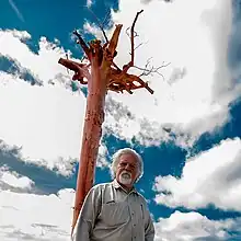 In 2017, for the Bonavista Biennale, he created a site-specific sculptural installation of an inverted tree piece, Waiting/Watching/Waiting that took an entire village of helpers in Newfoundland to make. The trees, carefully selected for their height and strength, stripped of their bark and sealed with red ochre and linseed oil were inverted into deep holes that had been dug into a rocky causeway. Their roots were up top like antennae.[8] In 2019, he created a complex tree installation which included large scale woodcut plates and prints at the Buffalo, New York Arts Studio.[3] In 2020, he was Artist in Residence at the Art Gallery of Hamilton and in the year-long period of time created, with the help of volunteers, We All Felt That, 2020, of suspended maple, wool felt, and steel (top) and a large wall drawing with the word for tree in different languages.[9]