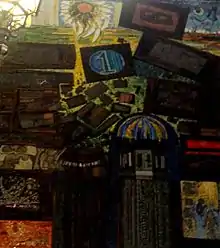 Marxhausen's murals were unconventionally built and unique in the choice of materials. Besides using Venetian glass, he also incorporated brick and his characteristic burnt wood which he epoxied onto plywood panels that were later butted tightly to one another without the use of grout.[29]