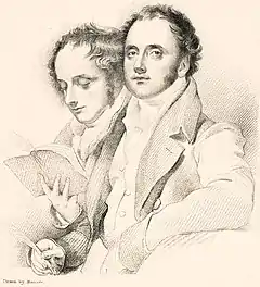 At the other end of the century, the scholarly Notes and Queries published a list of other literary parodies,[17] among which two further successors to the Rejected Addresses are noted. Peter George Patmore's Rejected Articles (1826) is a prose equivalent, imitating the style of articles in magazines of the day, among which feature the two Smith brothers themselves and William Cobbett, the target of their earlier work.[18] The other successor is William Frederick Deacon's Warreniana (1824), a mixture of prose and verse with, as a common focus, the advertisement of a commercial blacking product. Among the poetical works featured are "Old Cumberland Pedlar" by W. W., "Carmen Triumphale" by R. S., "The Childe's Pilgrimage" by Lord B., "The Dream: a psychological curiosity" by S. T. C. and "The Battle of Brentford Green" by Sir W. S.[19]