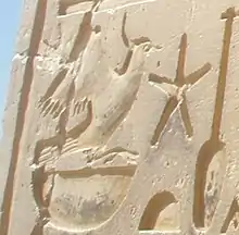 As a "symbol of the Egyptian servant population" the kings held the Rekhyt tightly in their hands. On the western wall of the second hypostyle hall in the Temple of Seti I in Abydos is a relief of Seti I, in which Seti kneels with the henu crown during his coronation before Amun-Re, to be appointed by Amun-Re as the rightful king of Egypt. Seti holds a Rekhyt lapwing in his left hand as a sign that all people in Egypt are under his rule. In his right hand is the Khopesh sword and the curved "war ax" that he receives from Amun-Re to ensure victory in battle.[11]
