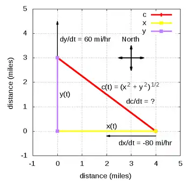 For example, one can consider the kinematics problem where one vehicle is heading West toward an intersection at 80 miles per hour while another is heading North away from the intersection at 60 miles per hour. One can ask whether the vehicles are getting closer or further apart and at what rate at the moment when the North bound vehicle is 3 miles North of the intersection and the West bound vehicle is 4 miles East of the intersection.