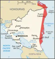 The former British colony of Mosquito Coast is marked in red.