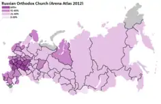 In the August of 2012 the first large-scale survey and mapping of religions in Russia based on self-identification was published in the Sreda Arena Atlas, an extension of the 2010 Census, with data on seventy-nine out of eighty-three of the federal subjects of Russia.[1][2] On a rounded total population of 142,800,000 the survey found that 66,840,000 persons, or 47.4% of the total population, were Christians.[1] Among them, 58,800,000 or 41.1% of the population were believers in the Russian Orthodox Church, 5,900,000 or 4.1% were Christians without any denomination, 2,100,000 or 1.5% were believers in Orthodox Christianity without belonging to any church or (a smaller minority) belonging to non-Russian Orthodox churches (including Armenian and Georgian), 400,000 or 0.2% were Orthodox Old Believers, 300,000 or 0.2% were Protestants, and 140,000 (less than 0.1%) were Catholics.[1] Among the non-Christians, 9,400,000 or 6.5% of the population were Muslims (including Sunni Islam, Shia Islam, and a majority of unaffiliated Muslims), 1,700,000 or 1.2% were pagans (including Rodnovery, Assianism, and other religions) or Tengrists (Turco-Mongol Shamanic religions and new religions), 700,000 or 0.5% were Buddhists (mostly of the Tibetan schools), 140,000 or 0.1% were Hindus (including Krishnaites), and 140,000 were religious Jews.[1] Among the not religious population, 36,000,000 people or 25% declared to "believe in God (or in a higher power)" but to "not profess any particular religion", 18,600,000 or 13% were atheists, and 7,900,000 or 5.5% did not state any religious, spiritual or atheist belief.[1]