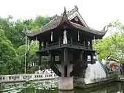 The earliest forms of Vietnamese religious practice were animistic and totemic in nature.[17] The decorations on Đông Sơn bronze drums, generally agreed to have ceremonial and possibly religious value,[nb 2] depict the figures of birds, leading historians to believe birds were objects of worship for the early Vietnamese. Dragons were another frequently recurring figure in Vietnamese art, arising from the veneration of Lạc Long Quân, a mythical dragon-king who is said to be the father of the Vietnamese people. The Golden Turtle God Kim Quy was said to appear to Emperors in times of crisis, notably to Lê Lợi, from whom he took the legendary sword Thuận Thiên after it had been dropped into Hoàn Kiếm Lake. Contact with Chinese civilization, and the introduction of the triple religion of Buddhism, Confucianism and Daoism, added a further ethical and moral dimension to the indigenous Vietnamese religion.[17] A recent research using folkloristic computations has provided evidence on the existence of "cultural additivity" by examining the interaction of Buddhism, Confucianism and Daoism throughout the history of Vietnam.[18]