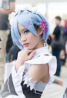 Rem is highly regarded in multiple multiple polls and awards. In the character selection of the 2015-2016 Innovative Animation Awards held by Kadokawa Corporation, Rem won first place.[49] She ranked sixth place in "The Most Attractive Female Character" held by Charapedia in Japan and the first place in the comprehensive selection.[50] In the 2017 annual Kono Light Novel ga Sugoi!, she won second place and eighth place in the 2018 awards. In the "2016 Anime Popularity Awards" hosted by Bilibili, Rem was ranked first in the female characters category.[51][52] In Newtype's monthly character survey, she also has a fairly high rating, ranking eighth in August,[53] in the top five in September,[54] and ranked first on October.[55] On November and December however, her ranking declined to the third and seventh places.[56][57] Her most notable award was ranking first place at the Best Girl category of the 1st Crunchyroll Anime Awards.[58][59] She has also gained the highest number of votes in Otamart's poll for the most popular two-dimensional character.[60]