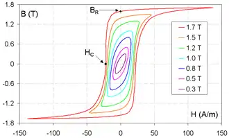 Remanence or remanent magnetization or residual magnetism is the magnetization left behind in a ferromagnetic material (such as iron) after an external magnetic field is removed.[1] Colloquially, when a magnet is "magnetized", it has remanence.[2] The remanence of magnetic materials provides the magnetic memory in magnetic storage devices, and is used as a source of information on the past Earth's magnetic field in paleomagnetism. The word remanence is from remanent + -ence, meaning "that which remains".[3]