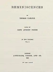 Carlyle explicitly directed that the Reminiscences were never to be published "without fit editing", but he reportedly later revoked this prohibition and gave his friend James Anthony Froude, the historian, permission to publish them should he see fit.[17][18][19] As Carlyle's death approached Froude had the work set up in type and wrote an introduction for it; in February 1881, three weeks after Carlyle's funeral, it was published by Longman.[20] Froude's edition was remarkably inaccurate, misreading, altering or re-arranging words, phrases, and even whole sentences.[21] Over 17,000 errors have been detected, albeit mostly minor ones.[22] In the United States Froude's edition was published by both Scribner and Harper, the two publishing houses being in dispute over which owned the US rights.[23][22] In 1887 the Reminiscences were edited anew by Charles Eliot Norton and published by Macmillan. This edition was greatly superior to Froude's, though still inaccurate by modern standards. Norton's edition was reprinted as part of Everyman's Library in 1932 with the addition, for the first time, of the reminiscence of Christopher North; and again in 1972 by Everyman University Library, with both "Christopher North" and "Sir William Hamilton" being included. Kenneth J Fielding and Ian Campbell's edition, published in 1997 by Oxford University Press in their Oxford World's Classics series, is described as "the most complete and authoritative to date".[24]