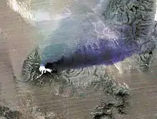The dynamic magma underneath plates we are living on induces volcanic activity on Earth's surface.[3] To advance the understanding in volcanological science and active volcano monitoring, the main data streams aided by remote sensing include surface deformation and thermal measurement plus the gas flux and composition.[32] Seismicity is considered geophysical method on the other hand. The data could be collected throughout the eruption cycle, from unrest, to eruption then relaxation.[32] For example, the Ultraviolet (UV) and VNIR region is sensitive to sulfur dioxide, one of the volcanic gases. BrO (formed from the bromine explosion within plumes)[33] and CO2 are also possible candidates for volcanic monitoring these days.[32] The thermal disturbance, for instance through temperature change in crater lakes and injection of hot gas into the atmosphere, could be detected using TIR sensors to automate volcano thermal alerts.[32] The uplift and subsidence of ground could be quantified remotely by InSAR technique.[32] The surficial manifestation of volcanism tends to favor simple geometries while complexities are introduced by subsurface interactions.[32] While remote sensing is able to collect data of ground, 3-D modeling using finite element analysis added with geophysical subsurface survey is highly encouraged.[32]