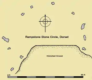The area of modern Dorset has only a "thin scatter" of stone circles,[12] with nine possible examples known within its boundaries.[13] The archaeologist John Gale described these as "a small but significant group" of such monuments,[13] and all are located within five miles of the sea.[14] Of the Dorset circles, Rempstone is the only example that is not located on the chalk hills west of Dorchester.[15] The Dorset circles have a simplistic typology, being of comparatively small size, with none exceeding 28 metres (92 feet) in diameter.[16] All are oval in shape, although perhaps have been altered from their original form.[17] The Rempstone circle is exceptional among these, as it is the only one which does not consist of sarsen stone.[15] However, like all the others—with the exception of the circle at Litton Cheney—it does not display evidence of any outlying stones or earthworks.[18]