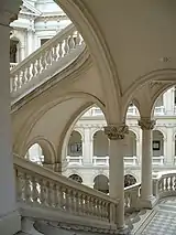 One of the most widely copied features of Renaissance architecture were the great staircases from the chateaux of Blois and Chambord.[6] Blois had been the favourite residence of the French Kings throughout the renaissance. The Francis I wing, completed in 1524, of which the staircase is an integral part was one of the earliest examples of French Renaissance.[7] French renaissance architecture was a combination of the earlier Gothic style coupled with a strong Italian influence represented by arches, arcades, balustrading and, in general, a more flowing line of design than had been apparent in the earlier Gothic. The Chateau de Blois's triumphal staircase was imitated almost from the moment of its completion, and was certainly the predecessor of the "double staircase" (sometimes attributed to Leonardo da Vinci) at the Château de Chambord just a few years later.