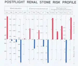 Data gathered during 129- to 208-day Shuttle-Mir missions suggest that the spaceflight environment and subsequent return to Earth change the composition of the astronauts' urine and promoted the formation of renal stones.[19] This data shows that there was an increased risk for calcium oxalate and calcium phosphate stones during flight, and an increased risk for calcium oxalate and uric acid stones immediately after flight. This post-flight stone development could be attributed to low urine volumes and higher urinary pH.[15]