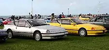 It was the first car launched by Alpine under Renault ownership (though Alpine had been affiliated with Renault for many years, with its earlier models using many Renault parts). Longer, wider, and taller, it effectively updated the design of its predecessor, the Alpine A310, updating that car's silhouette with modern design features like body-integrated bumpers and a triangular C-pillar with the large rear windshield. Like its predecessor, it used the V6 PRV engine in a rear-engined layout, with extensive use of Polyester plastics and fibreglass for the body panels making it lighter and quicker than rivals such as the Porsche 944. Passenger room increased, making the rear seat more useful, while equipment was much more complete and now included items such as power locks.[3] It was one of the most aerodynamic cars of its time, and the naturally aspirated version achieved a record 0.28 drag coefficient in its class.[3] Due to its bigger tires and need for more cooling intakes, the Turbo's drag coefficient was a bit higher: 0.30 . The GTA name, used to denote the entire range of this generation, stands for "Grand Tourisme Alpine," but in most markets, the car was marketed as the Renault Alpine V6 GT or as the Renault Alpine V6 Turbo.[4] In Great Britain, it was sold simply as the Renault GTA,[5] as Sunbeam (and then Chrysler/Talbot) had been using the "Alpine" badge since the 1950s.