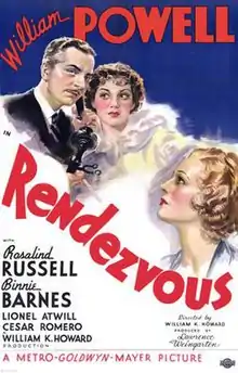 Rendezvous is a 1935 American spy film set in World War I, directed by William K. Howard, starring William Powell and Rosalind Russell and featuring Binnie Barnes, Lionel Atwill, Cesar Romero and Samuel S. Hinds. Powell plays an American cryptologist who tangles with German spies while falling in love.