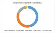 Rendham has a healthy populous, the majority of the population (175 people) in 2011 having very good health or good health. Only 41 people had fair, bad or very bad health.[4] Most people in Rendham have at least one qualification with only 32 people in 2011 not having one and 77 people having a level four qualification or above.[5] Most of Rendham in 2001 was aged between 30 and 59 (116 people) with only a small proportion of younger people (only 60 people aged between zero and 19) compared to 20-year-olds and over making 202 of the population with 116 of those people as stated before being between 30 and 59.[6] 61% of the population in 2011 was Christian (132 people).[7]