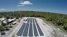 Funding to provide solar panels with battery backup to the Northern atolls was provided by a NZ$20.5 million aid programme from the New Zealand Ministry of Foreign Affairs and Trade, with construction provided by PowerSmart Solar of New Zealand.[4] The first solar site at Rakahanga was completed in September 2014. Pukapuka and Nassau were next, going online at Christmas 2014. Construction began at Tongareva on 23 February 2015 and just 10 weeks later both villages Omoka and Te Tautua were running on solar power.[5] Manihiki was progressed at the same time. In June 2015 all of the northern atolls were fully solar powered, reducing the need to send ships north during the November to April cyclone season.[6] A second phase of the project to provide solar farms to Atiu, Mangaia, Mauke and Mitiaro was completed in July 2019.[7]