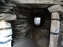 The earth house is located in a farmyard near the southeastern shore of the Bay o' Firth, on the Mainland of Orkney, in Scotland. Access to the underground monument is by ladder to a hatch in the roof.[1] The souterrain has an entrance passage which is 3.5 m (11 ft) long with a drop of around 0.7 m (2 ft 4 in) to the floor of the chamber. The chamber is hexagonal in shape and measures 3.3 m (11 ft), and is 2.5 m (8 ft 2 in) in width. The walls were built with a combination of slabs laid on edge and rough masonry. The 1.5 m (4 ft 11 in) corbelled roof is supported by four stone pillars.The walls are lined with five small alcoves.[2][3]