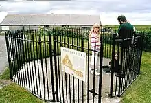 The Iron Age monument was discovered when a threshing machine caused the roof to collapse on 12 November 1926. During the initial examination of the structure, the chamber floor was covered with a large number of skeletal remains, and an ox-scapula, which was probably used as a spade. In all, the disarticulated skeletal remains were determined to be six adults and twelve children, probably belonging to two or three family groups.[2][3] The remains have been dated from the middle to late Iron Age, several hundred years after the earth house was initially constructed.[4]