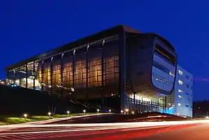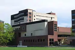 On 3 October 2008, the university celebrated the grand opening of the Experimental Media and Performing Arts Center (EMPAC) situated on the west edge of campus.[48] The building was constructed on the precipice of the hill, with the main entrance on top. Upon entering, elevated walkways lead into a 1,200-seat concert hall. Most of the building is encased in a glass exoskeleton, with an atrium-like space between it and the "inner building". Adjacent to and underneath the main auditorium there is a 400-seat theater, offices, and two black-box studios with 35-foot (11 m) to 45-foot (14 m) ceilings.[49] Originally budgeted for $50 million, the EMPAC construction costs ballooned to over $200 million due to difficulty of anchoring the foundation in the soft clay of the hill.[50]