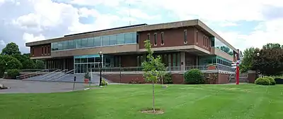 Another unique building is the Voorhees Computing Center (VCC). Originally the St. Joseph's Seminary chapel, it was built in 1933 and acquired by Rensselaer in 1958, and after renovation served as the institute's library from 1960 until the completion of the new Folsom Library, in 1976.[44] The Folsom Library, located adjacent to the computing center, has a concrete exterior that was designed to harmonize with the light gray brick of the chapel;[45] architecturally, it is an example of the modern brutalist style.[46] Subsequently, the university was unsure of what to do with the chapel, or whether to keep it at all, but in 1979 decided to preserve it and renovate it to house computer labs and facilities to support the institute's computing initiatives. Today the VCC serves as the backbone for the institute's data and telephony infrastructure.