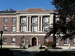 President Palmer Ricketts supervised the construction of the school's "Green Rooftop" Colonial Revival buildings that give much of the campus a distinct architectural style. Buildings constructed during this period include the Carnegie Building (1906), Walker Laboratory (1907), Russell Sage Laboratory (1909),[41] Pittsburgh Building (1912), Quadrangle Dormitories (1916–1927), Troy Building (1925), Amos Eaton Hall (1928), Greene Building (1931) and Ricketts Building (1935). Also built during this period was "The Approach" (1907), a massive ornate granite staircase found on the west end of campus. Originally linking RPI to the Troy Union Railroad station, it again serves as an important link between the city and the university.[42] In 1906 the '86 Field, home field of the football team until 2008, was completed with support of the Class of 1886.