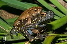 Adult males measure 70–79 mm (2.8–3.1 in) and adult females 99–102 mm (3.9–4.0 in) in snout–vent length. The snout is angular, truncate in dorsal profile, but slightly projecting beyond the lower jaw in lateral profile. The eyes are large. The tympanum is distinct. The fingers have basal webbing and large terminal discs. The toes are webbed and bear small terminal discs. Females have mostly smooth skin. The base color is light yellow, which turns dark grey when stressed and/or handled. There are bright yellow spots on the back, side of head, flanks, dorsal surface of limbs, gular, ventrolateral region, and chest. Males are uniform brown to orangish and lack distinct patterns, but have a higher degree of tuberculation.[1]