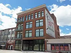 The building was rebuilt in 1901 to replace the original 1893 structure that was destroyed by fire, and was commissioned by sisters Margaret and Rebecca Renwick. It is frequently (but wrongly) attributed to their brother William Renwick, who was a prosperous area industrialist in the late 19th and early 20th centuries.[3][4] Two of the family's Davenport houses are also on the National Register of Historic Places, the Renwick House on Brady Street and the Renwick Mansion, which is a contributing property in the St. Katherine's Historic District. The reconstructed building contained 40,000 square feet of combined retail and warehouse space and was designed for tenant Drake Furniture & Carpet Co.; it continued to house various successor furniture stores over the years. The storefront was modernized in the 1930s.[5] The building sat empty until 2012 when Restoration St. Louis, who also renovated the Forrest Block and the Hotel Blackhawk, began a $4.5 million renovation of the building.[6] The upper floors house 18 loft-style apartments and commercial space on the main floor.