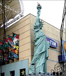 A large modern replica stands in front of the New York City Center, a shopping center constructed in 1999 in Barra da Tijuca in the State of Rio de Janeiro. 22.9992837°S 43.360481°W