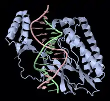 Tus, also known as terminus utilization substance, is a protein that binds to terminator sequences and acts as a counter-helicase when it comes in contact with an advancing helicase.[2] The bound Tus protein effectively halts DNA polymerase movement.[2] Tus helps end DNA replication in prokaryotes.[2]