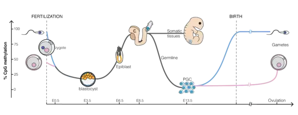 After fertilization some cells of the newly formed embryo migrate to the germinal ridge and will eventually become the germ cells (sperm and oocytes) of the next generation. Due to the phenomenon of genomic imprinting, maternal and paternal genomes are differentially marked and must be properly reprogrammed every time they pass through the germline. Therefore, during the process of gametogenesis the primordial germ cells must have their original biparental DNA methylation patterns erased and re-established based on the sex of the transmitting parent.